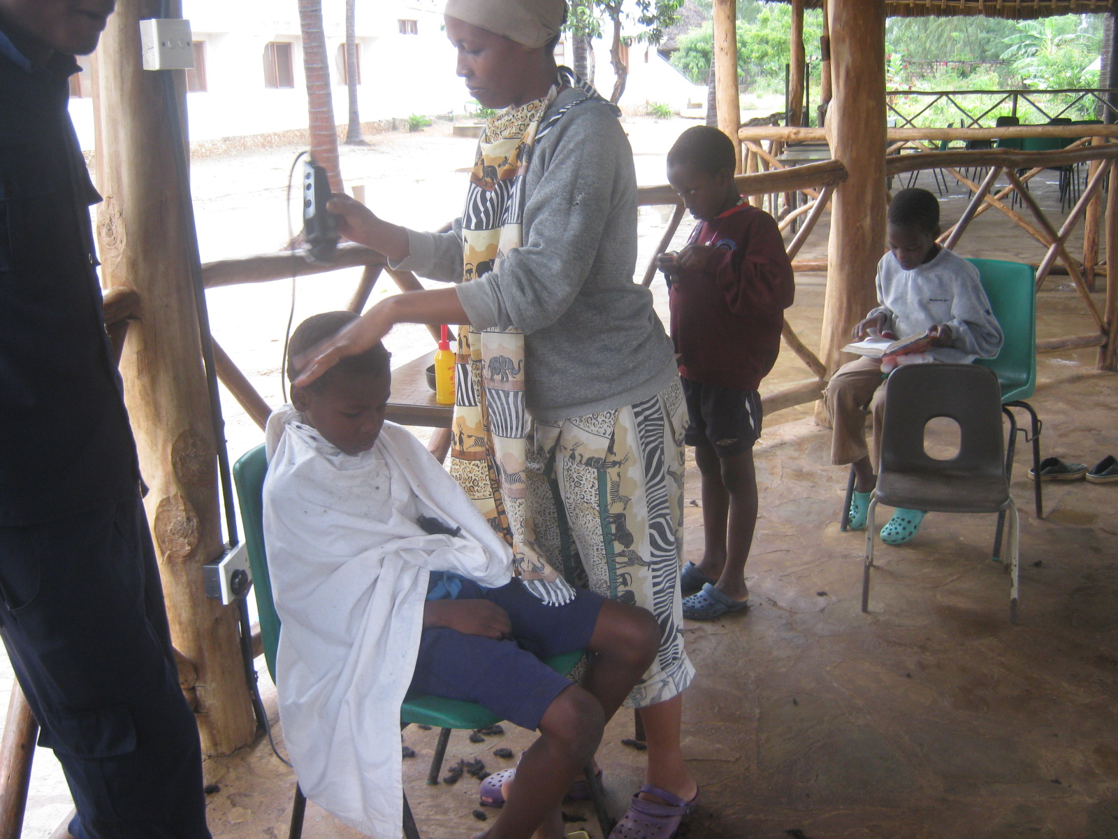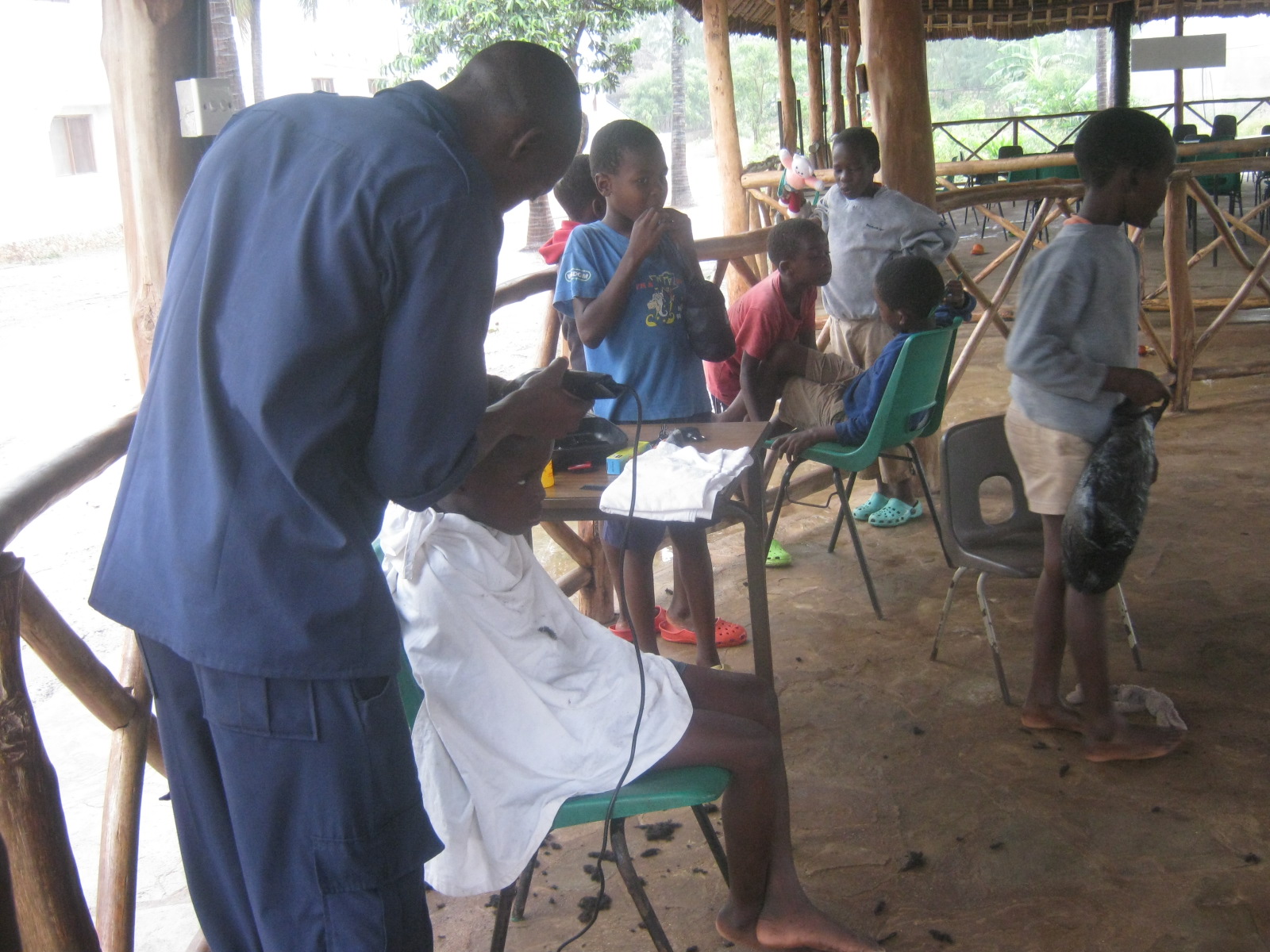 The barber , who is the one to shave them is Uncle Alex and Aunt Rehema help him.