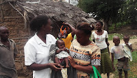 Uncle Billy went out to the village with Uncle Scott, Auntie Nancy plus some of our older children who had not gone on visits to relatives, who were anxious to make their new little sister feel welcome (Sulieman,Mariam, Daniella and Maria are pictured right with Auntie Nancy saying hello to Neema)