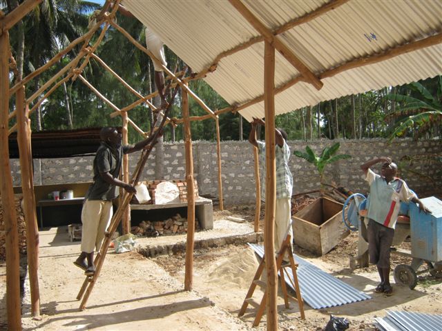 It’s a race to beat the rains as the roof goes on the walkway linking the indoor and outdoor kitchens.