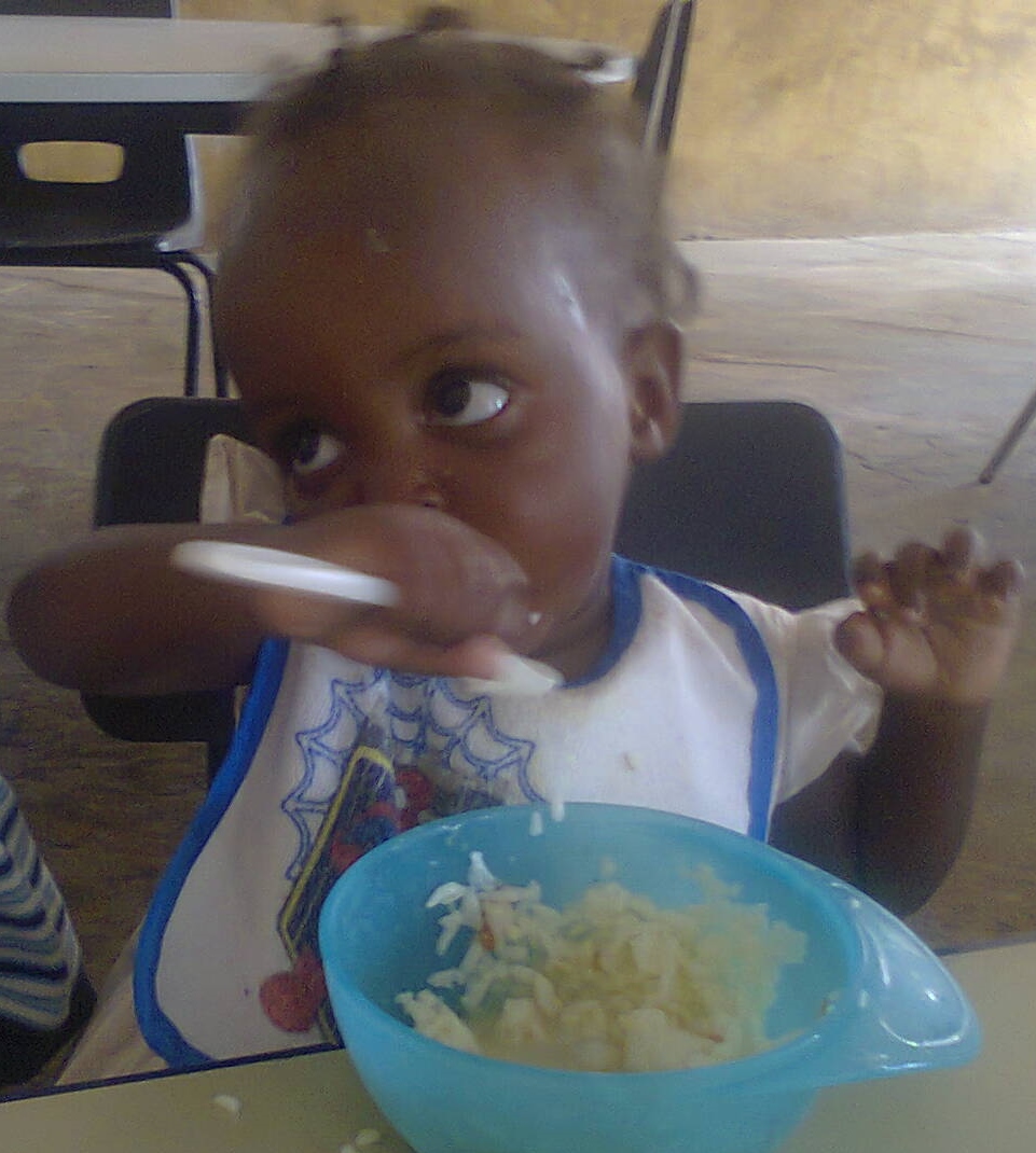 Uncle Billy says: ” Esther is learning how to use her spoon and she’s doing a good job and certainly enjoying herself, giggling and laughing all the way! ”
