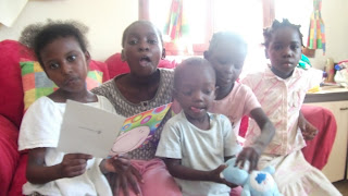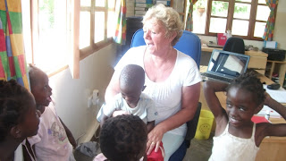Rather tha wake him,  Mama Sue waited until yesterday when one of       his big sisters Saumu escorted the three year old to Mama’s       office, followed by a contingent of other children eager to see       what was happening.