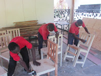 And we are using locally-bought materials in our joinery workshop where our joiner, Unce Charo, and his assistant are busy making 250 chairs that are needed by school.