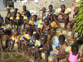 The Happy House Family went swimming on Friday, a  great time was had by all. We gave them all hot dogs and crisps with tomato  sauce at half time!. The day before we had bought 20 sets of arm bands, as some  of the children said they could already swim! Wrong!! They thought  that being in the water was swimming. We had plenty of staff in the water  with them so everyone was safe, children, and staff really enjoyed it.  So now when we have a birthday it is a pool party that everyone wants. Next  week we have 3 birthdays, so we are combining them into one party. Yes, you have  it, the kids wanted to swim 3 times!!