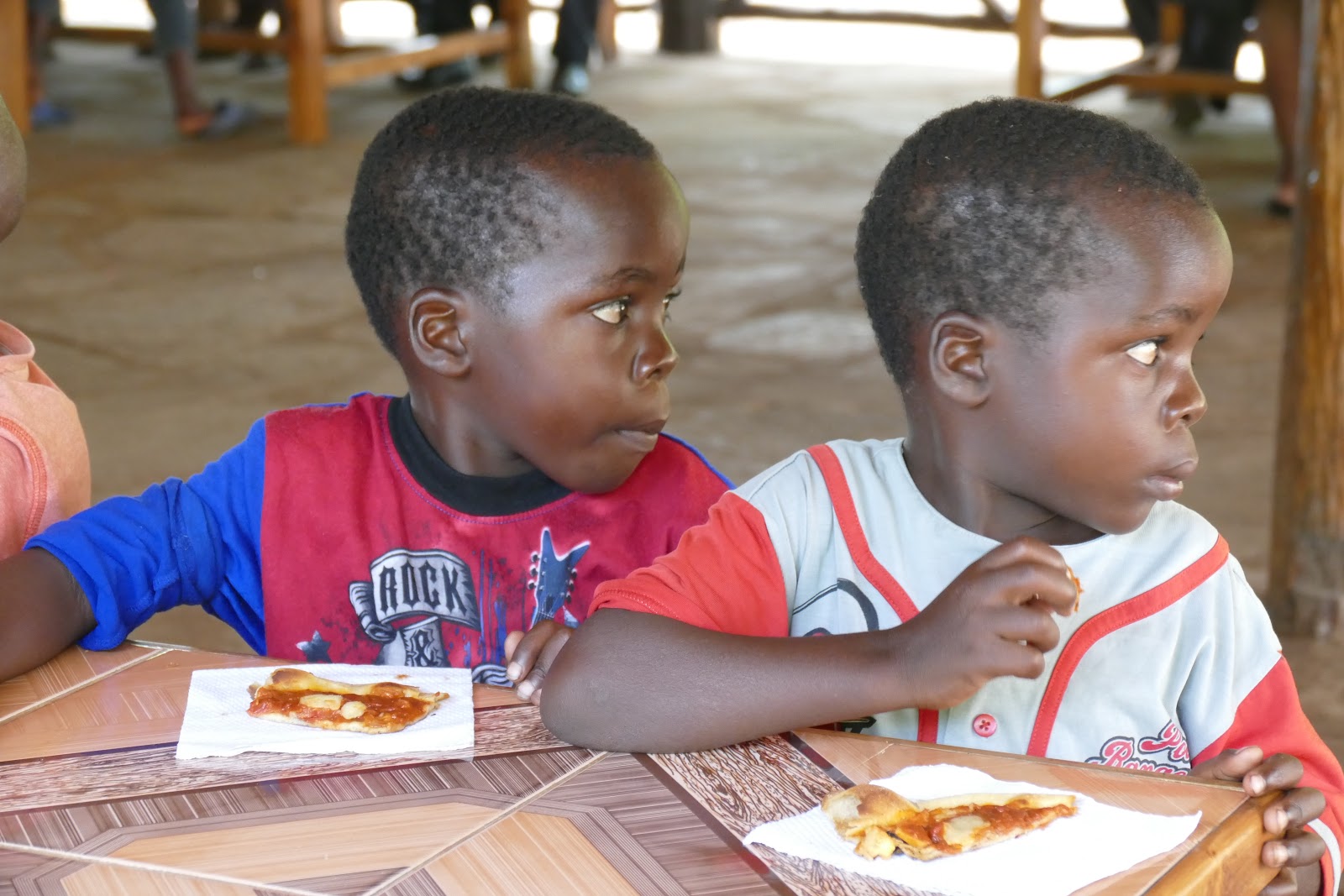 After lunch of pizza, the little ones carry on playing and while the older ones stay behind to tell Mama and Papa about their lives in the community. They share news and experiences and talk about their schools and their marks.