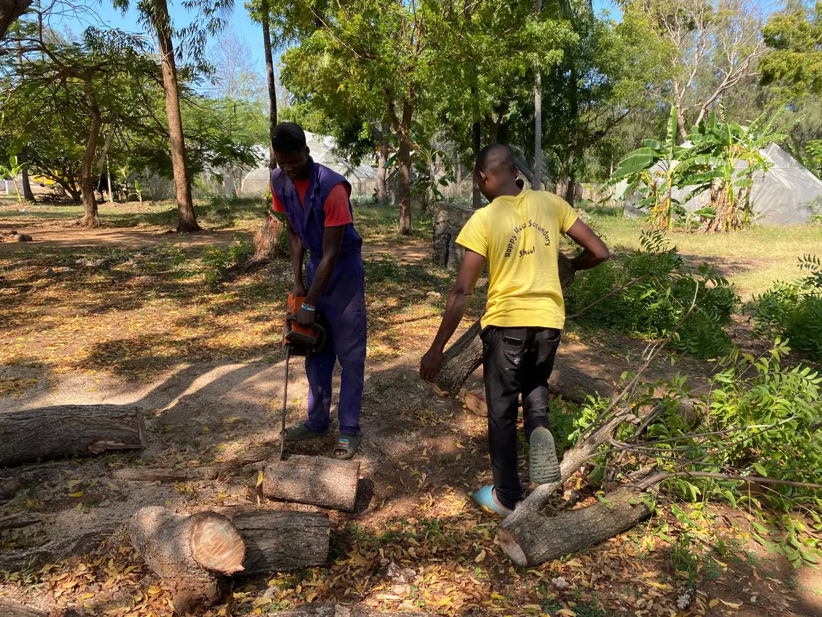 Gardener Tevin and his colleague, Sifa, have been lending their strength and teamwork to an important task — cutting firewood for the kitchen.