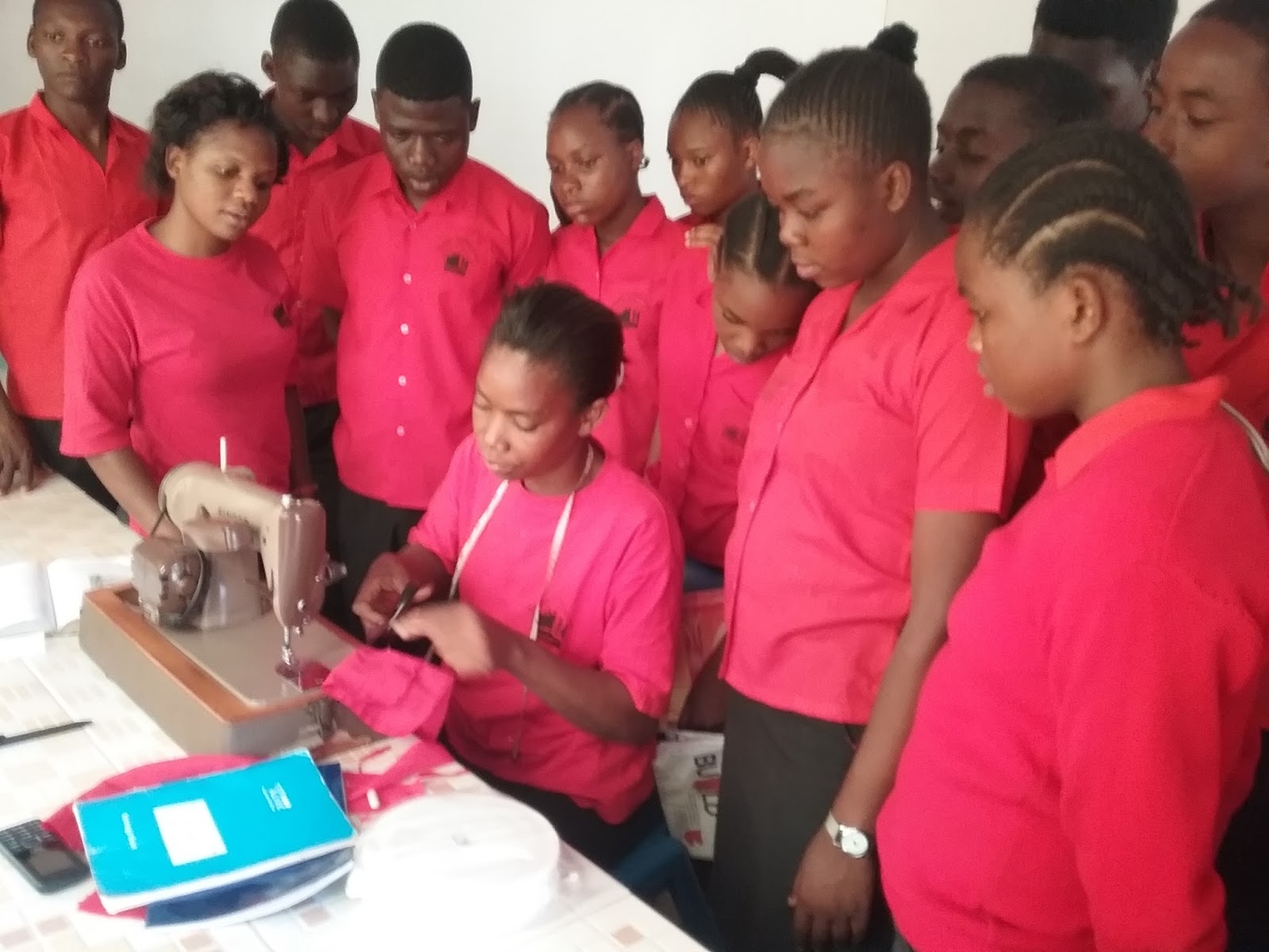 Our Form 1 secondary students who have been learning about sewing machines are pictured here on a visit from school  to Auntie Lucy, our Happy House seamstress.