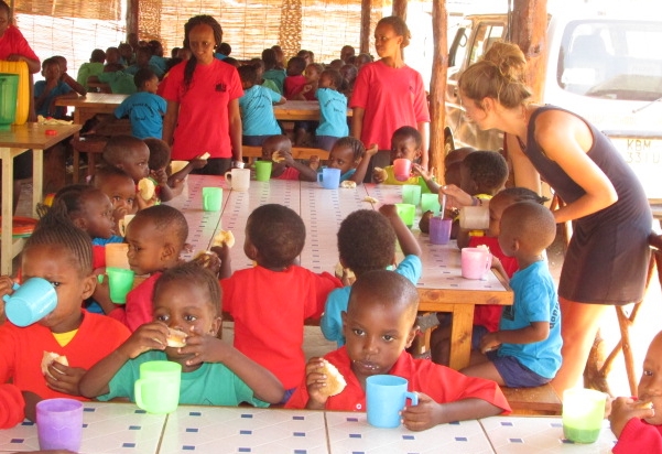 Teachers and volunteers oversee snack time, with the food and drink being prepared in the Happy house kitchen and then transported down the lane to school.