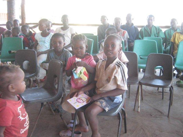 As Neema toddled over to big “brothers” Suleiman and Francis to help with the unwrapping Natasha kept a watchful eye on her friend …from a distance!