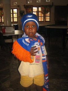 He stepped in as a willing model  for the hat and scarf given to Mama Sue by Blackpool Seagulls Ice Hockey team.