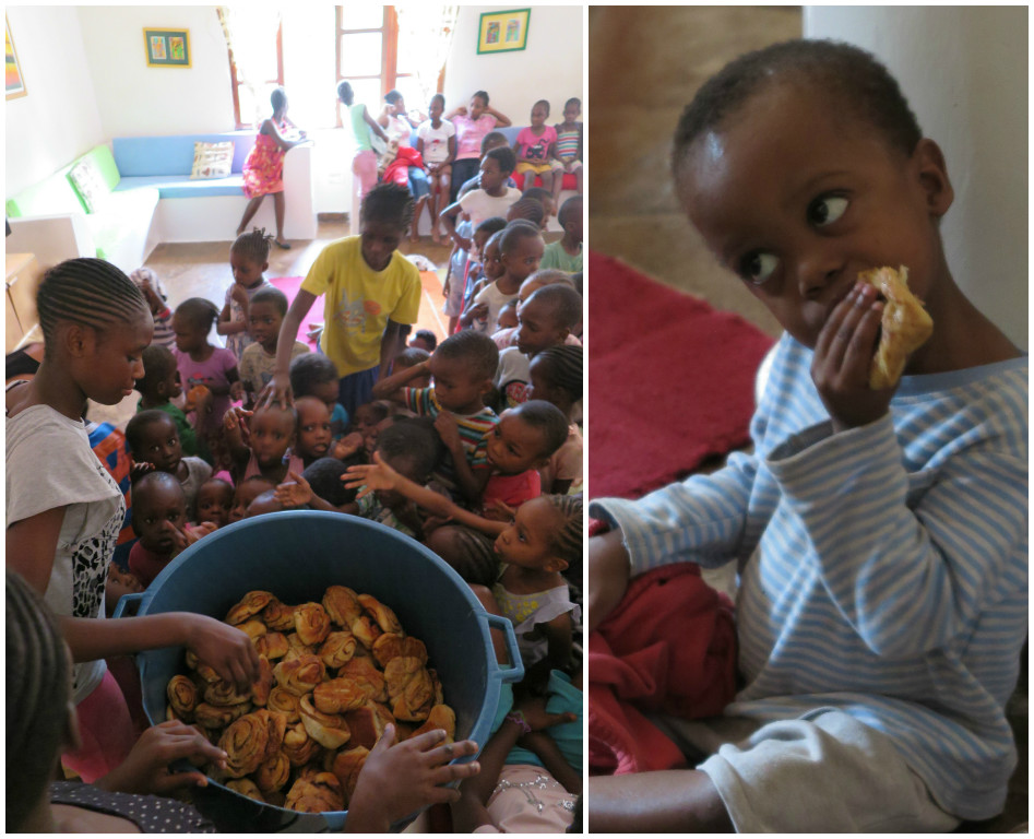 However, it took some time to bake all 200 cinnamon rolls in the oven. Meanwhile we had good time to clean the kitchen and sing some songs together. We saw many little heads impatiently peeking from the kitchen door as the whole Happy House was filled with delicious cinnamon scent. Finally the last baking tray of steaming hot cinnamon rolls came out from the oven and it was time to taste – for everybody. The cinnamon rolls vanished fast in to the mouths of the children.We were truly impressed by the kids. Everybody were involved and worked so nicely and happily together.