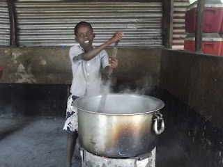 I was helping Uncle Jospat to stir the soup and rice and to put the plates in the store and then sorting the rice before cooking and serving rice on the plates so the kids can eat well .