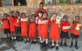 The mum of Djamila, one of our day pupils at Happy House school, very kindly sent in a gift of coloured pencils, balloons, pens and sweets.