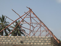 The roof framework is going up, the brickwork has been faced up and internal walls plastered on our new classrooms.