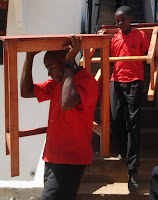 When the tables ,made from materials bought locally and beautifully constructed and finished, were teady to deliver from the joinery workshop at Happy House to our school older older boys were eager to help.