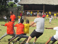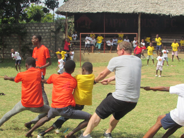No sooner had they arrived at Happy House than our visitors were roped into taking part in a test if strength!